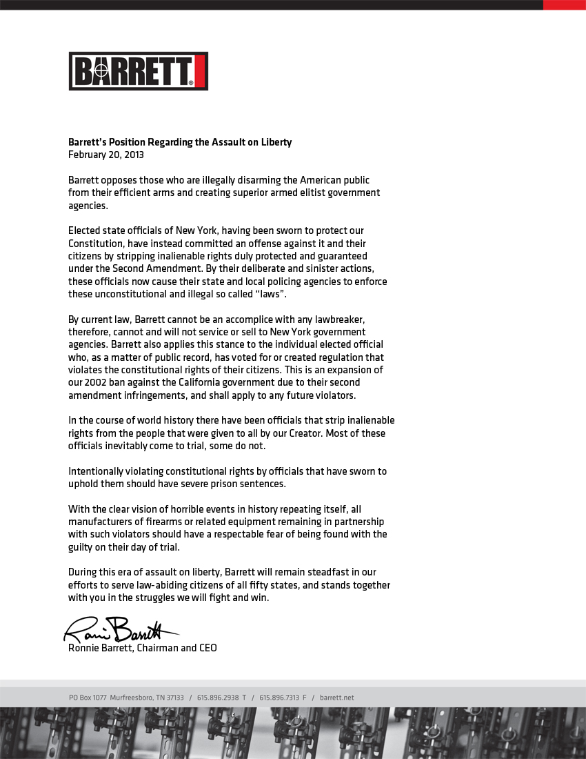 Barrett’s Position Regarding the Assault on Liberty February 20, 2013 Barrett opposes those who are illegally disarming the American public from their efficient arms and creating superior armed elitist government agencies. Elected state...
